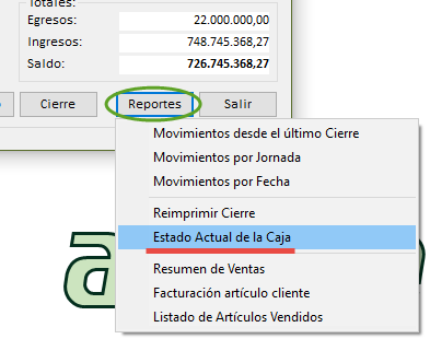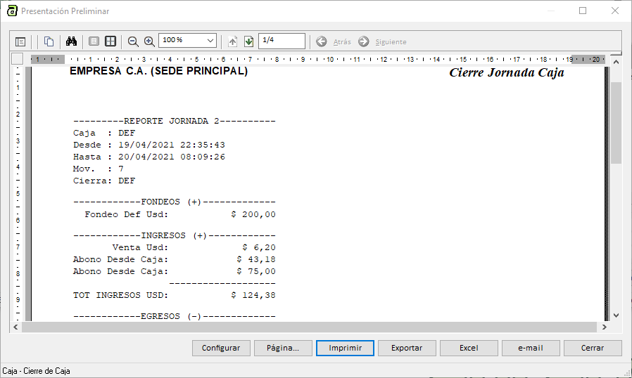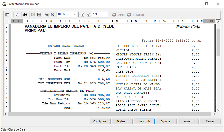 Aparece entonces un reporte de cierre de caja como en la siguiente imagen: