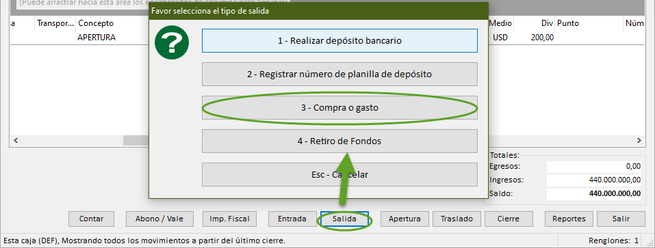 Para fondear saldo a la caja previamente abierta, se hace clic en Apertura. Para retirar saldo se hace clic en Salida y luego en Retiro de Fondos.