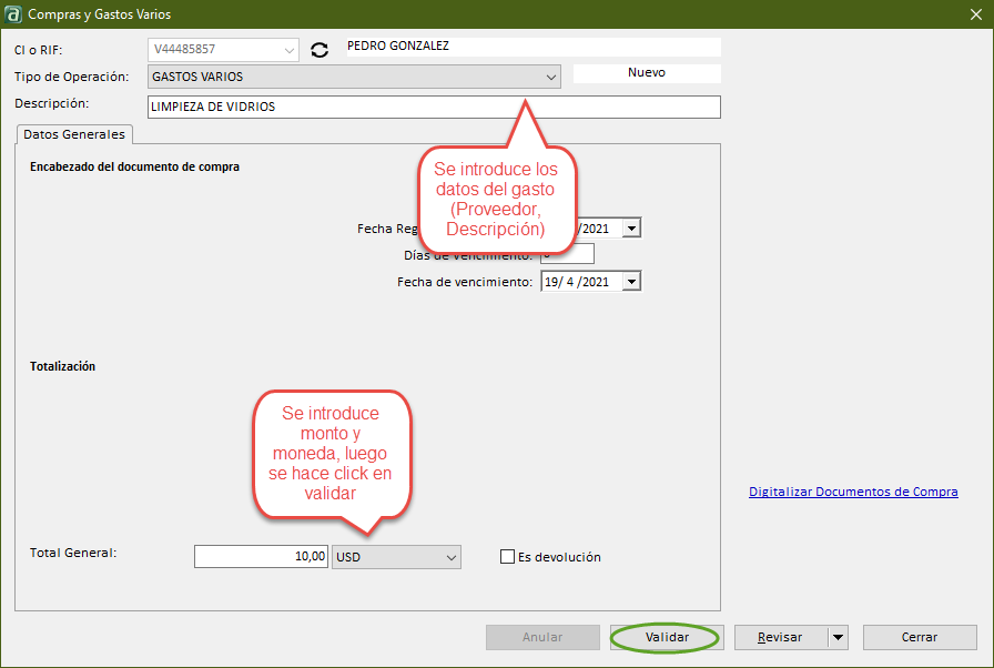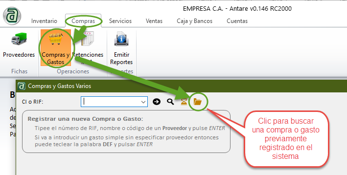 Este botón abre la ventana Compras y Gastos Varios, se teclea la cédula o RIF del proveedor para abrir la ventana: