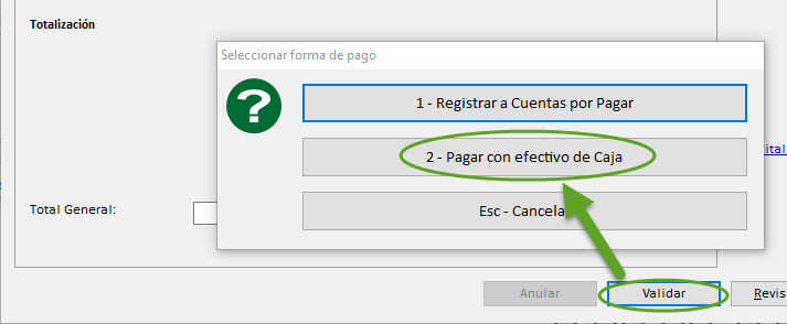 Al validar la compra pregunta si la misma se pagará con efectivo de caja: