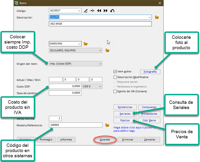 Desde la ficha Items se pueden alterar toda la info estática relacionada a un producto. Para colocar un producto en ficha, puede utilizar la siguiente ruta: