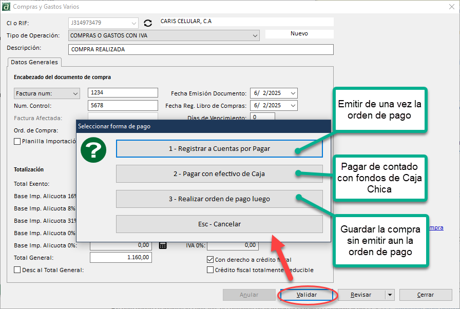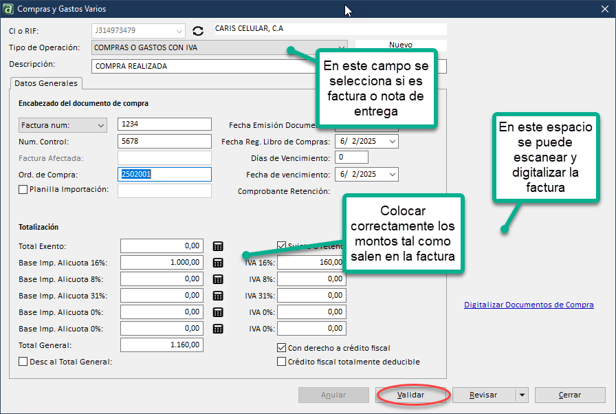 Al haber completado los datos, pulsar sobre Validar para guardar la correspondiente transacción.