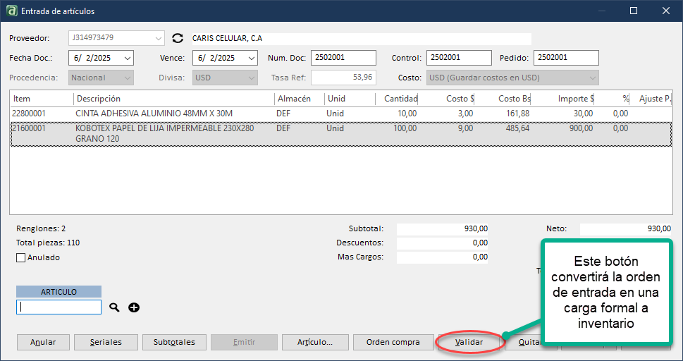 Luego al tener la orden de compra en pantalla, se pulsa sobre el botón Validar para efectivamente concretar la carga de inventario.