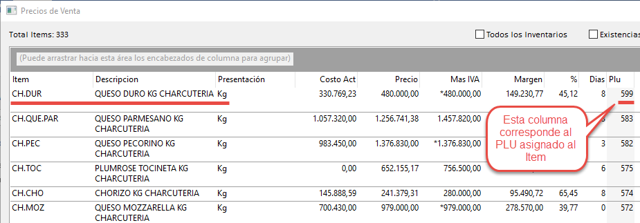 Es de hacer notar que el PLU no guarda ninguna relación directa con el código de Ítem. Los PLU son estrictamente numéricos y el código de Ítem contiene números y letras. Además, los PLU están relacionados directamente con el precio del Item, mas no con el Item en sí. Esto quiere decir que es perfectamente posible que si un Ítem tiene dos precios de venta entonces pueda tener dos PLU, uno por cada precio.