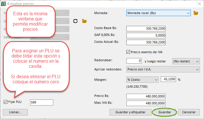 Para asignar un PLU a un precio, se hace doble clic sobre el renglón para mostrar la ventana que permite modificar el precio (y el PLU)