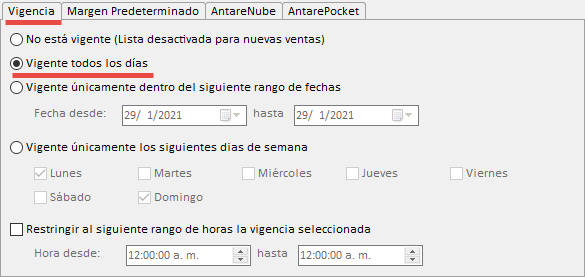 Esta pestaña actúa como filtro que permite programar, por ejemplo, precios de promoción que aplican todos los jueves. O bien, permite desactivar la lista completa al seleccionar la opción No está vigente.