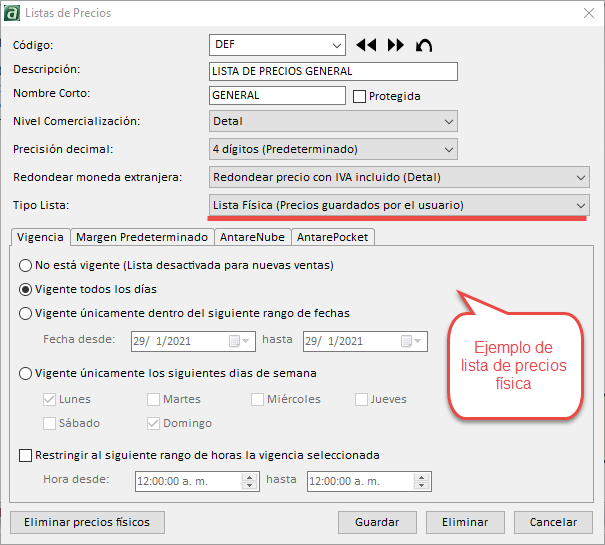 Cuando una lista de precios está marcada como física, el usuario debe fijar manualmente el correspondiente precio de venta de cada artículo. Este precio se mantiene fijo, independientemente si el costo de compra del artículo sufre variaciones. Quedando de parte del usuario estar pendiente de mantener los precios manualmente actualizados.