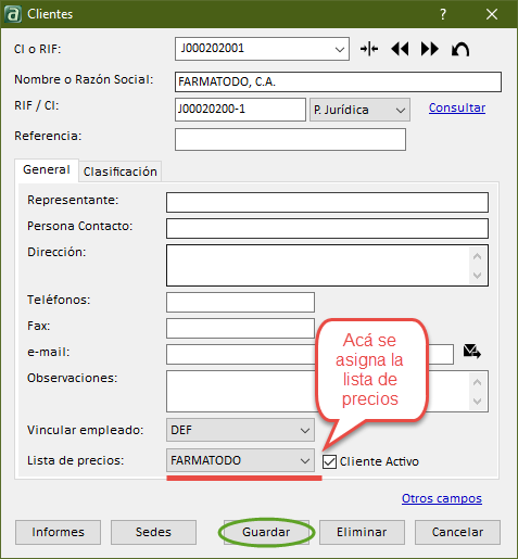 De esta manera, según este ejemplo, al registrar en Antare una venta al cliente FARMATODO estarán disponibles los precios que pertenecen a la lista FARMATODO.
