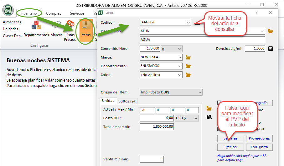 Para establecer el PVP de un artículo, se debe entrar a la ventana Precios de Venta. Esta se encuentra accesible desde la ficha Items o bien desde el listado Precios de Venta.