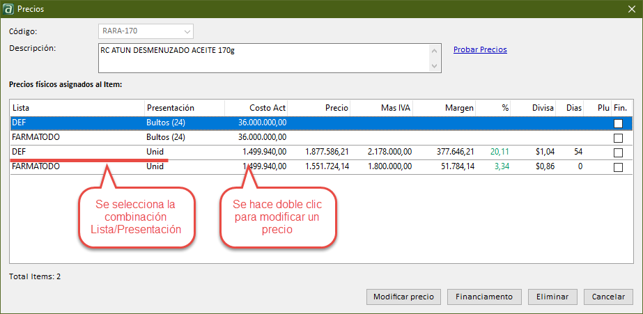 Para modificar individualmente el precio de la Presentación y Lista deseados se debe hacer doble clic sobre el renglón correspondiente: