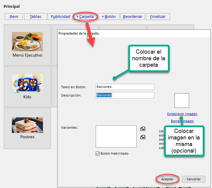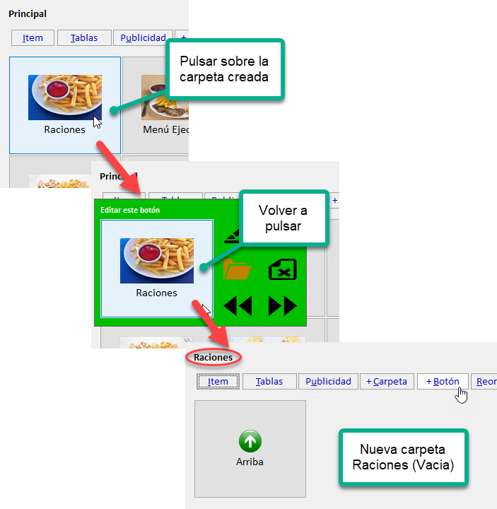 Las carpetas se utilizan para agrupar botones de acuerdo a cierto criterio o categoría. Al pulsar sobre un botón de tipo carpeta, se muestra un submenú con los botones que esta contiene. Un ejemplo de carpetas puede ser: Empanadas, Bebidas.